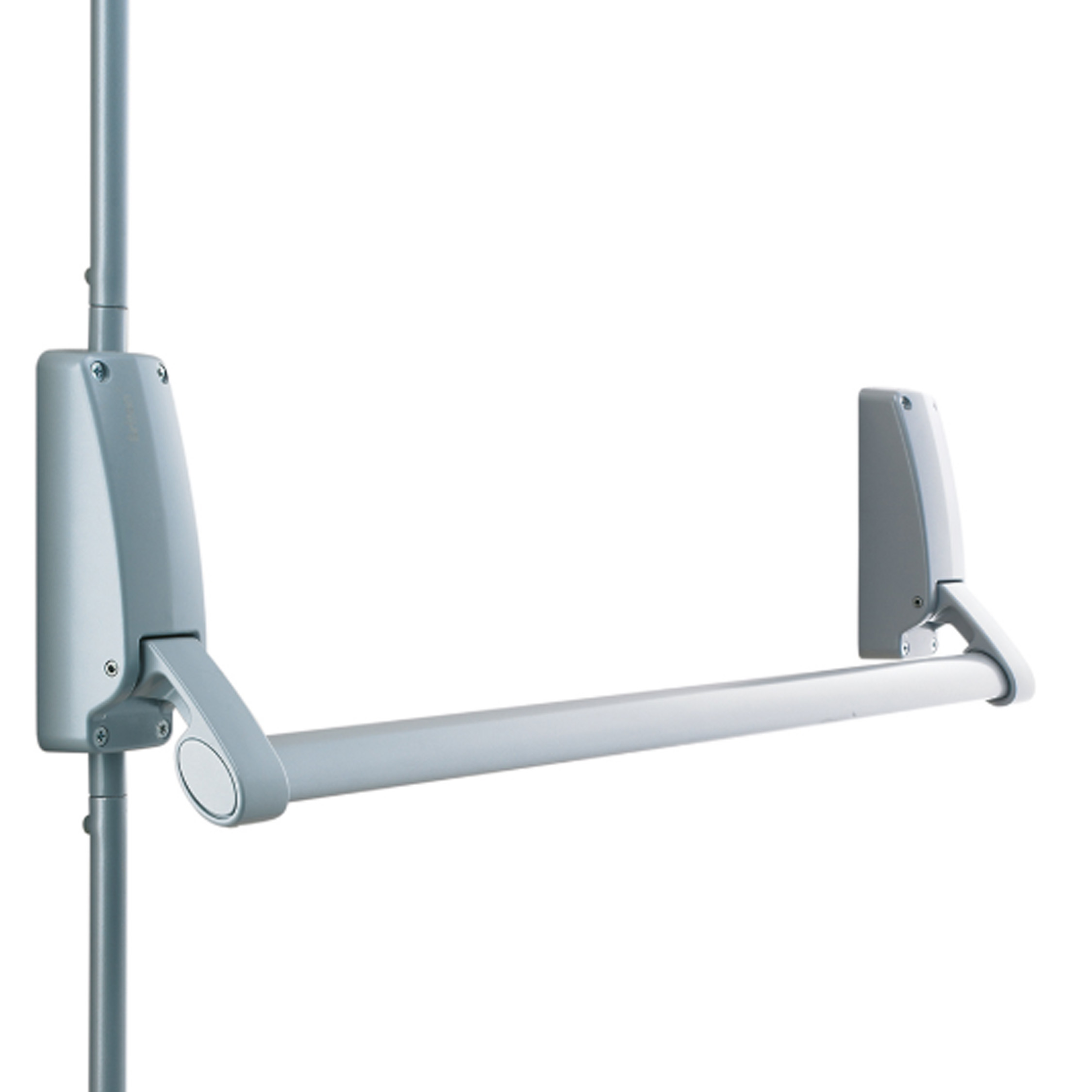 Surface mounted push bar panic exit device with vertical bolts operating top and bottom of the door.