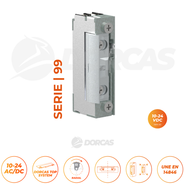 The Dorcas Serie 99 is the most compact and versatile line of electric strikes in the Dorcas catalog. It is specifically engineered to fit into narrow door profiles (such as aluminum, PVC, or steel) where frame depth is extremely limited.